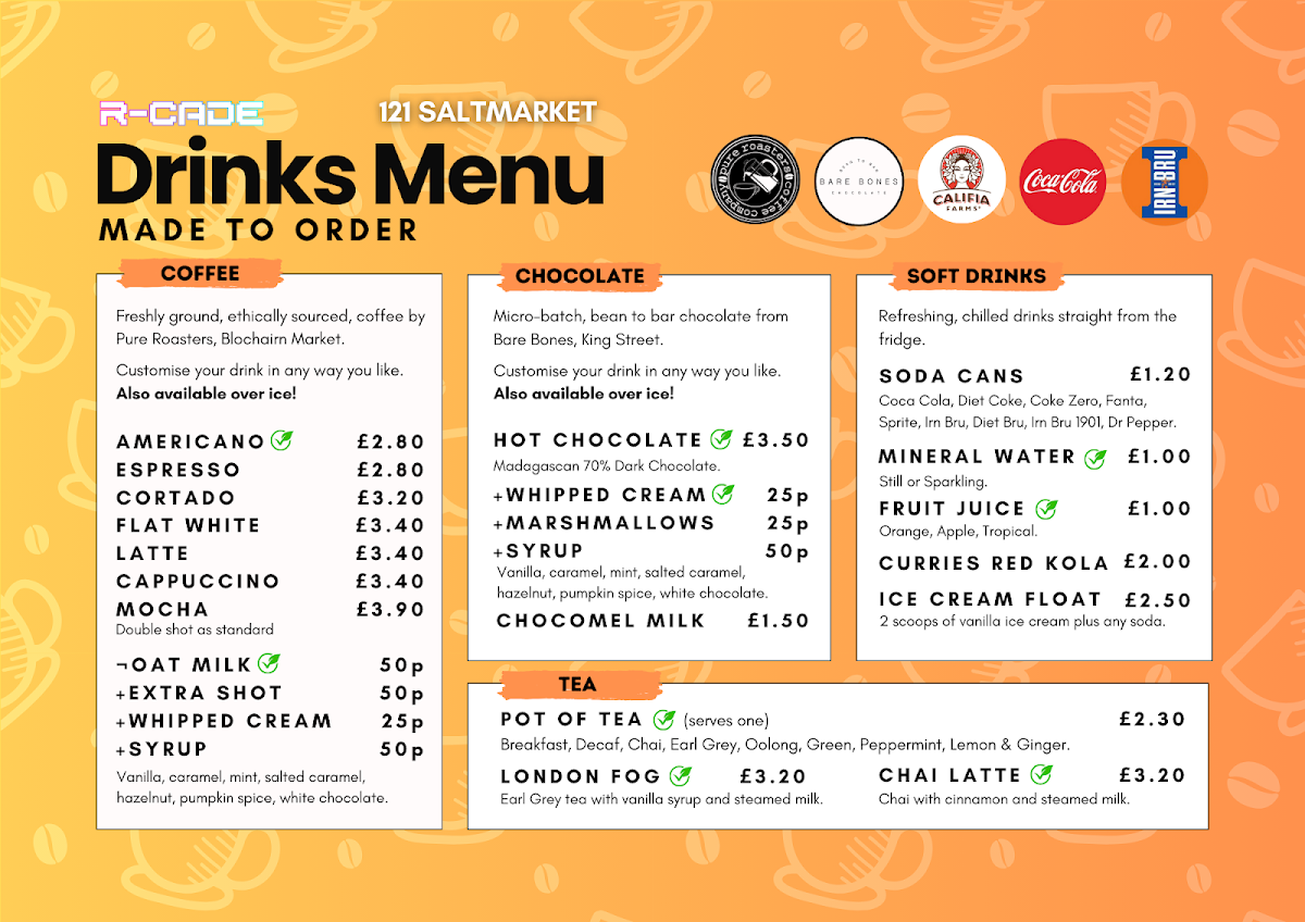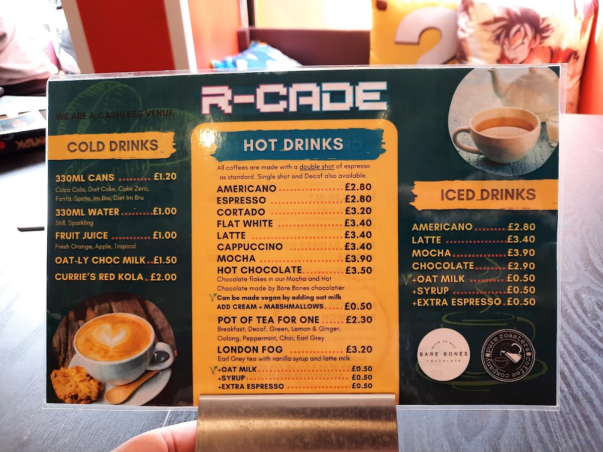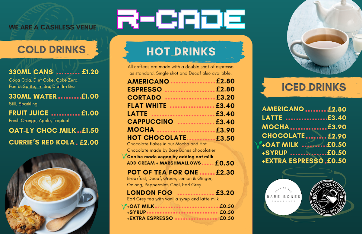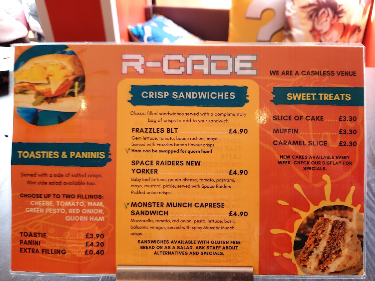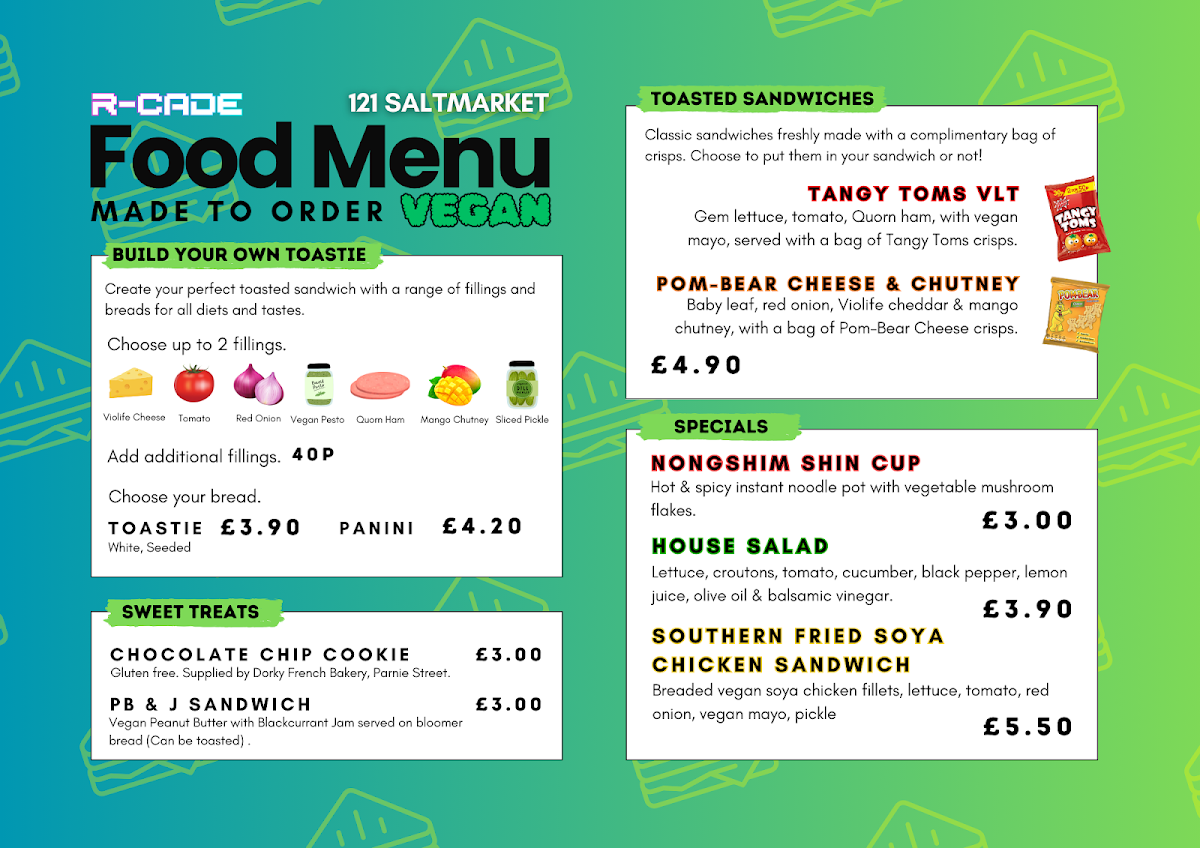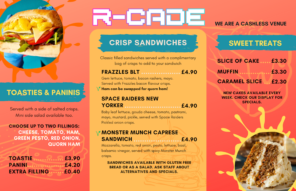 Welcome to R-CADE, an exciting café located in the heart of Glasgow at 121 Saltmarket. This vibrant venue is perfect for gamers and foodies alike, featuring a menu that delights the senses while offering a unique gaming experience. Highlights include the Frazzles VLT Sandwich, a delicious buttered sandwich filled with fresh lettuce, tomato, cucumber, vegan mayo, and quorn ham, complemented by a packet of Bacon Fries for that extra crunch—all for just £4.00. Equally enticing is the Space Raiders New Yorker, a buttered ciabatta (or bagel) loaded with pastrami, gouda, and pickle, paired with crunchy Space Raiders for just £4.50. The atmosphere buzzes with energy and nostalgia as families and friends engage in countless video and board games. With friendly staff dedicated to creating a welcoming environment, R-CADE is not just a meal; it's a playful culinary experience. Don’t miss this gem when you’re in town!